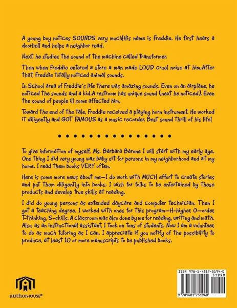 A young boy notices SOUNDS very much!His name is Freddie. He first hears a doorbell and helps a neighbor read. Next, he studies the sound of the machine called transformer. Then when Freddie entered a store a man made LOUD cruel noise at him.After that, Freddie totally noticed animal sounds. In School area of Freddie's life there was amazing sounds. Even on an airplane, he noticed the sounds and a kid.A restroom has unique sound (next he noticed). Even the sound of people ill some affected him. Toward the end of the tale, Freddie received a playing horn instrument. He worked it diligently and GOT FAMOUS as a music recorder. Best sound thrill of his life!