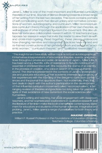 Janet L. Miller is one of the most important and influential curriculum theorists of our time. Sounds of Silence Breaking presents a broad range of her writing from the last two decades. This book contains portraits of self-complicating work that disrupt unitary and normative conceptions of women, autobiography, and curriculum. Miller reconceptualizes curriculum theory through the application of her own theories, as well as those of other important figures in the movement. She also utilizes her extensive collaborative research with K-12 teachers and juxtaposes her essays in ways that invite the reader to view them as self- and cross-interrogating. Read together, these pieces underscore how changing narrative and interpretive practices have framed and re-framed constructions of her gendered work and selves as «academic woman», «curriculum theorist», and «qualitative researcher».