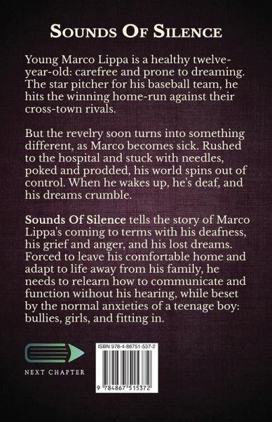 Young Marco Lippa is a healthy twelve-year-old: carefree and prone to dreaming. The star pitcher for his baseball team, he hits the winning home-run against their cross-town rivals. But the revelry soon turns into something different, as Marco becomes sick. Rushed to the hospital and stuck with needles, poked and prodded, his world spins out of control. When he wakes up, he's deaf, and his dreams crumble. Sounds Of Silence tells the story of Marco Lippa's coming to terms with his deafness, his grief and anger, and his lost dreams. Forced to leave his comfortable home and adapt to life away from his family, he needs to relearn how to communicate and function without his hearing, while beset by the normal anxieties of a teenage boy: bullies, girls, and fitting in.
