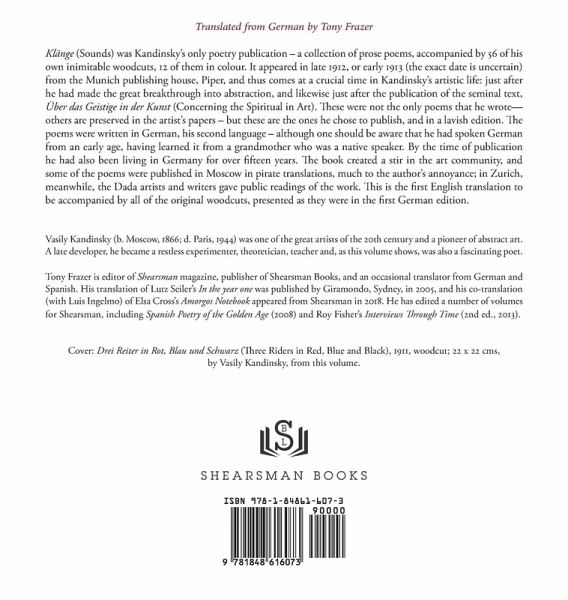 Klaenge (Sounds) was Kandinsky's only poetry publication - a collection of prose poems, accompanied by 56 of his own inimitable woodcuts, 12 of them in colour. It appeared in late 1912, or early 1913 (the exact date is uncertain) from the Munich publishing house, Piper, and thus comes at a crucial time in Kandinsky's artistic life: just after he had made the great breakthrough into abstraction, and likewise just after the publication of the seminal text, Ueber das Geistige in der Kunst (Concerning the Spiritual in Art). These were not the only poems that he wrote-others are preserved in the artist's papers - but these are the ones he chose to publish, and in a lavish edition. The poems were written in German, his second language - although one should be aware that he had spoken German from an early age, having learned it from a grandmother who was a native speaker. By the time of publication he had also been living in Germany for over fifteen years. The book created a stir in the art community, and some of the poems were published in Moscow in pirate translations, much to the author's annoyance; in Zurich, meanwhile, the Dada artists and writers gave public readings of the work. This is the first English translation to be accompanied by all of the original woodcuts, presented as they were in the first German edition.