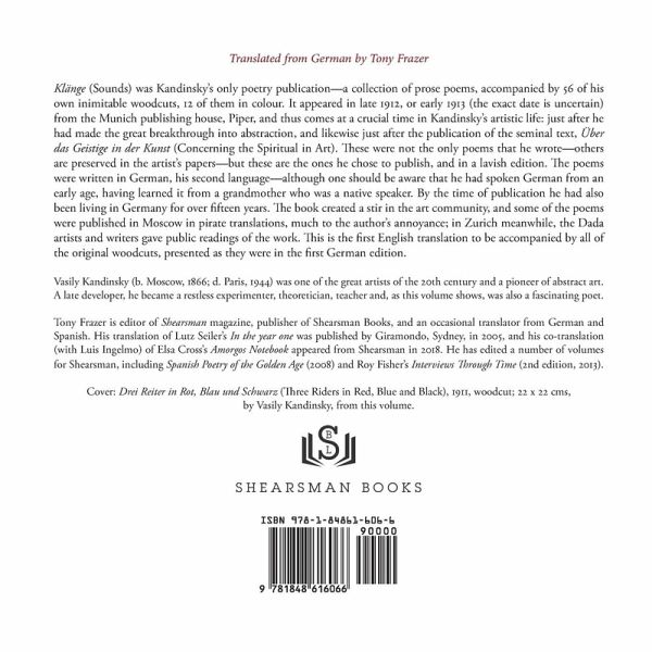 Kandinsky’s poetry is little known in the English-speaking world, even amongst lovers of his art. Klaenge appeared from Piper Verlag in Munich in 1912 or 1913 – the exact date is uncertain – in a splendid volume, 29 cms square – this translated edition is, by contrast, 20 cms square). Many of the poems dated back a few years, but they were very much of their time and were prized both in the artist’s native Russia (where some pirated translations appeared) and in the German-speaking world. In fact, the Dada group gave readings from Klaenge in Zurich.