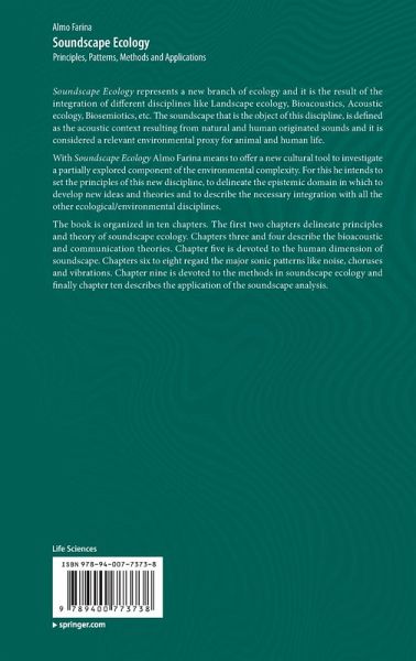 With Soundscape Ecology Almo Farina means to offer a new cultural tool to investigate a partially explored component of the environmental complexity. For this he intends to set the principles of this new discipline, to delineate the epistemic domain in which to develop new ideas and theories and to describe the necessary integration with all the other ecological/environmental disciplines.