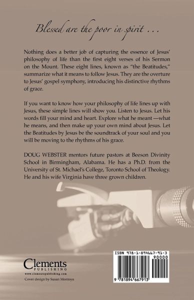Nothing does a better job of capturing the essence of Jesus' philosophy than the first eight verses of his Sermon on the Mount. These eight lines, known as the Beatitudes, summarize what it means to follow Jesus. They are the overture to Jesus' gospel symphony, introducing his distinctive rhythms of grace. If you want to know how your philosophy of life lines up with Jesus, these simple lines will show you. Listen to Jesus. Let his words fill your mind and heart. Explore what he meant-what he means, and then make up your own mind about Jesus. Let the Beatitudes by Jesus be the soundtrack of your soul and you will be moving to the rhythms of his grace. Doug Webster mentors future pastors at Beeson Divinity School in Birmingham, Alabama. He has Ph.D. from the University of St. Michael's College, Toronto School of Theology. he and his wife Virginia have three grown children.
