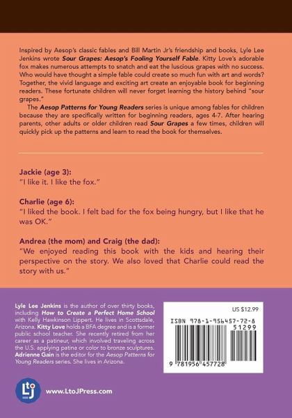 Inspired by Aesop's classic fables and Bill Martin Jr's friendship and books, Lyle Lee Jenkins wrote Sour Grapes: Aesop's Fooling Yourself Fable. Kitty Love's adorable fox makes numerous attempts to snatch and eat the luscious grapes with no success. Who would have thought a simple fable could create so much fun with art and words? Together, the vivid language and exciting art create an enjoyable book for beginning readers. These fortunate children will never forget learning the history behind "sour grapes." The Aesop Patterns for Young Readers series is unique among fables for children because they are specifically written for beginning readers, ages 4-7. After hearing parents, other adults or older children read Sour Grapes a few times, children will quickly pick up the patterns and learn to read the book for themselves.