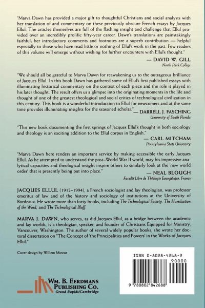 This is a print on demand book and is therefore non- returnable. This book is composed of eight articles written by Ellul and not previously translated into English. The eight were chosen not necessarily for their clarity or power to convince, but because they are the earliest formulations of some of Ellul's key ideas.