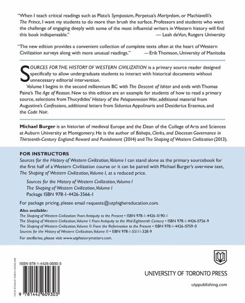 Sources for the History of Western Civilization is a primary source reader designed specifically to allow undergraduate students to interact with historical documents without unnecessary editorial intervention. Volume I begins in the second millennium BC with The Descent of Ishtar and ends with Thomas Paine's The Age of Reason. New to this edition are an example for students of how to read a primary source, selections from Thucydides' History of the Peloponnesian War, additional material from Augustine's Confessions, additional letters from Sidonius Appolinaris and Desiderius Erasmus, and the Code Noir.