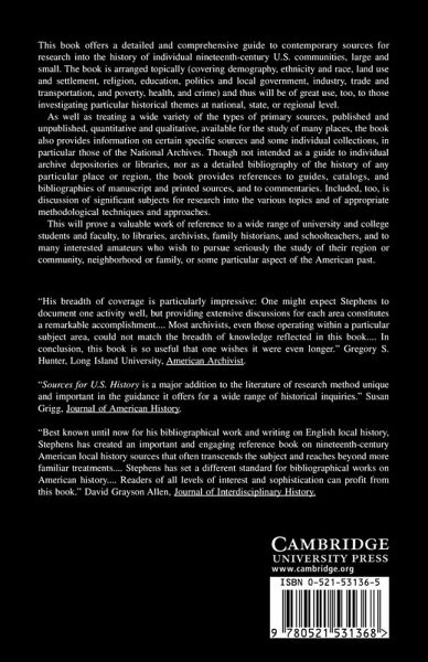 This book offers a detailed and comprehensive guide to contemporary sources for research into the history of individual nineteenth-century U.S. communities, large and small. The book is arranged topically (covering demography, ethnicity and race, land use and settlement, religion, education, politics and local government, industry, trade and transportation, and poverty, health, and crime) and thus will be of great use to those investigating particular historical themes at national, state, or regional level. As well as examining a wide variety of types of primary sources, published and unpublished, quantitative and qualitative, available for the study of many places, the book also provides information on certain specific sources and some individual collections, in particular those of the National Archives.