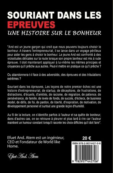 "A travers l'entrepreneuriat, And se lance dans un voyage périlleux pour aider les gens à choisir le bonheur. Il est confronté à des vicissitudes délicates lorsque son propre bonheur est mis à rude épreuve. Il doit maintenant appliquer à lui-même les mêmes principes et croyances qu'il prêche aux autres. Peut-il mettre en pratique ce qu'il prêche ? Ou abandonnera-t-il face à des adversités, des épreuves et des tribulations extrêmes ? Souriant dans les épreuves, Les leçons de notre premier échec est une histoire d'entrepreneuriat, de startup, de déceptions, de frustrations, de distractions, d'écueils, d'amitiés, de racisme, de migration, de patience, de persévérance, de famille, de levée de fonds, de succès, d'échecs, de business model, de défis, de foi, de pardon, de liberté, d'inspiration, de motivation, de développement personnel et surtout une grande leçon d'humilité. Au fil de la lecture, on s'identifie parfois à l'auteur et sa quête de bonheur, dans d'autres cas, on se retrouve à pleurer et plus tard à rire car l'auteur maintient un humour constant lorsqu'il raconte les choix difficiles qu'il doit faire".