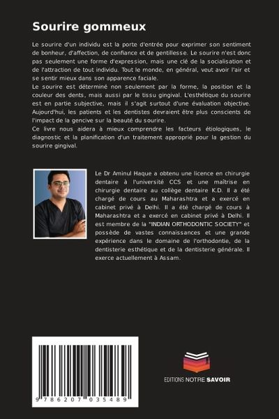 Le sourire d'un individu est la porte d'entrée pour exprimer son sentiment de bonheur, d'affection, de confiance et de gentillesse. Le sourire n'est donc pas seulement une forme d'expression, mais une clé de la socialisation et de l'attraction de tout individu. Tout le monde, en général, veut avoir l'air et se sentir mieux dans son apparence faciale.Le sourire est déterminé non seulement par la forme, la position et la couleur des dents, mais aussi par le tissu gingival. L'esthétique du sourire est en partie subjective, mais il s'agit surtout d'une évaluation objective. Aujourd'hui, les patients et les dentistes devraient être plus conscients de l'impact de la gencive sur la beauté du sourire.Ce livre nous aidera à mieux comprendre les facteurs étiologiques, le diagnostic et la planification d'un traitement approprié pour la gestion du sourire gingival.