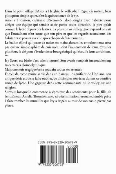 Dans le petit village d'Asteria Heights, le volley-ball règne en maître, bien plus qu'un simple sport, c'est la quintessence de la vie. Amelia Thomson, capitaine déterminée, doit jongler avec habileté pour diriger une équipe qui semble avoir perdu toute direction, la pire qu'ait connue le lycée depuis des lustres. La pression ne s'allège guère quand on sait que l'entraîneur n'est autre que son père et que les regards accusateurs des habitants se posent sur elle après chaque défaite cuisante. Le ballon élimé qui passe de mains en mains durant les entraînements n'est pas qu'une simple sphère de cuir usée : c'est l'incarnation de leurs rêves les plus fous, la clé pour s'évader de ce bourg étriqué qui étouffe leurs ambitions. *** Ivy Scott, est bénie d'un talent naturel. Son avenir semblait inexorablement tracé vers la gloire olympique. Mais une nuit tragique brise soudain toutes ses attentes. Forcée de reconstruire sa vie dans un hameau insignifiant de l'Indiana, son unique désir est de se faire oublier, de dissimuler son éclat durant sa dernière année de lycée. Une gageure dans cette communauté où le volley est une religion. Surtout lorsqu'elle commence à éprouver des sentiments pour la fille de l'entraîneur. Amelia Thomson, avec sa détermination farouche, semble prête à faire tomber les murailles que Ivy a érigées autour de son cur, pierre par pierre.