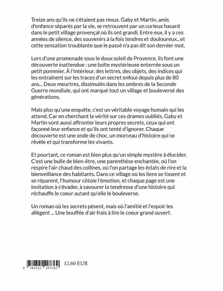 Treize ans qu'ils ne s'étaient pas revus. Gaby et Martin, amis d'enfance séparés par la vie, se retrouvent par un curieux hasard dans le petit village provençal où ils ont grandi. Entre eux, il y a ces années de silence, des souvenirs à la fois tendres et douloureux...et cette sensation troublante que le passé n'a pas dit son dernier mot. Lors d'une promenade sous le doux soleil de Provence, ils font une découverte inattendue : une boîte mystérieuse enterrée sous un petit pommier. À l'intérieur, des lettres, des objets, des indices qui les entraînent sur les traces d'un secret enfoui depuis plus de 80 ans... Deux meurtres, dissimulés dans les ombres de la Seconde Guerre mondiale, qui ont marqué tout un village et bouleversé des générations. Mais plus qu'une enquête, c'est un véritable voyage humain qui les attend. Car en cherchant la vérité sur ces drames oubliés, Gaby et Martin vont aussi affronter leurs propres secrets, ceux qui ont façonné leur enfance et qu'ils ont tenté d'ignorer. Chaque découverte est une onde de choc, un morceau d'histoire qui se révèle et qui transforme les vivants. Et pourtant, ce roman est bien plus qu'un simple mystère à élucider. C'est une bulle de bien-être, une parenthèse enchantée, où l'on respire l'air chaud des collines, où l'on partage les éclats de rire et la bienveillance des habitants. Dans ce village où les liens se tissent et se réparent, l'humour côtoie l'émotion, et chaque page est une invitation à s'évader, à savourer la tendresse d'une histoire qui réchauffe le coeur autant qu'elle le bouleverse. Un roman où les secrets pèsent, mais où l'amitié et l'espoir les allègent ... Une bouffée d'air frais à lire le coeur grand ouvert.