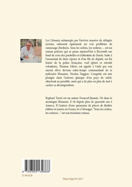 Les Libanais submergés par l'arrivée massive de réfugiés syriens fuyant la guerre civile qui sévit dans leur pays, subissent également un vrai problème de ramassage de poubelles. "Sous les cèdres, les ordures..." est un roman policier qui se passe aujourd'hui à Beyrouth sur fond d'immondices et d'attentats de Daesh.Suite à l'assassinat de deux ripoux et du fils d'un député, Thomas Glières, ancien limier de la police française, veuf éploré et jeune retraité, est appelé à l'aide par son ancien élève devenu depuis commandant de la judiciaire libanaise, Nicolas Naggiar.L'enquête est une plongée dans l'univers glauque d'un pays de soleil, attachant au possible, mais qui a de plus en plus de mal à cacher sa décomposition.