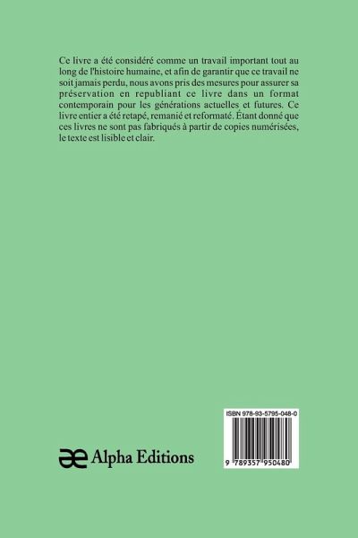 Sous les déodars, un livre classique, a été considéré comme important tout au long de l'histoire de l'humanité, et pour que cet ouvrage ne soit jamais oublié, chez Alpha Editions, nous avons fait des efforts pour sa préservation en rééditant ce livre dans un format moderne pour les générations présentes et futures. Tout ce livre a été reformaté, retapé et conçu. Ces livres ne sont pas constitués de copies numérisées de leur ¿uvre originale et le texte est donc clair et lisible.