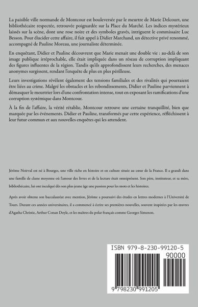 La paisible ville normande de Montcour est bouleversée par le meurtre de Marie Delcourt, une bibliothécaire respectée, retrouvée poignardée sur la Place du Marché. Les indices mystérieux laissés sur la scène, dont une rose noire et des symboles gravés, intriguent le commissaire Luc Besson. Pour élucider cette affaire, il fait appel à Didier Marchand, un détective privé renommé, accompagné de Pauline Moreau, une journaliste déterminée. En enquêtant, Didier et Pauline découvrent que Marie menait une double vie : au-delà de son image publique irréprochable, elle était impliquée dans un réseau de corruption impliquant des figures influentes de la région. Tandis qu'ils approfondissent leurs recherches, des menaces anonymes surgissent, rendant l'enquête de plus en plus périlleuse. Leurs investigations révèlent également des tensions familiales et des rivalités qui pourraient être liées au crime. Malgré les obstacles et les rebondissements, Didier et Pauline parviennent à démasquer le meurtrier lors d'une confrontation intense, tout en exposant les ramifications d'une corruption systémique dans Montcour. À la fin de l'affaire, la vérité rétablie, Montcour retrouve une certaine tranquillité, bien que marquée par les événements. Didier et Pauline, transformés par cette expérience, réfléchissent à leur futur commun et aux nouvelles enquêtes qui les attendent.