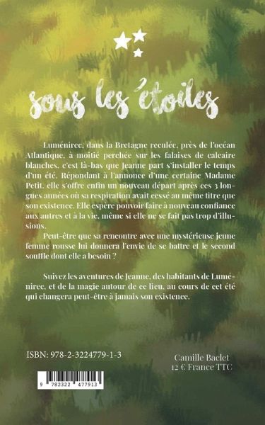 Camille Baclet est née en 1998 en Franche-Comté. Passionnée depuis toujours par le dessin d'animation, les histoires d'aventures, de fantaisie et d'amour, elle se dirige lors de ses études supérieures vers une école d'art. Diplômée mention Bien en animation 3D en 2020, cette dernière décide en plein confinement de reprendre sa deuxième passion après le dessin : l'écriture. Trouvant un public sur Wattpad, elle se lance enfin en 2022 dans l'écriture de son premier roman original : Sous les étoiles. Animée par ses nombreuses passions, Camille se donne corps et âme pour proposer à ses lecteurs des livres sur des thèmes variés et engagés. Au détour de ces oeuvres, vous trouverez sûrement un bout de ses influences comme Amélie Poulain, Twilight, Hunger Games, Nana, Pandora Hearts, Outlander, Kiki la petite sorcière, Naruto ou encore La reine des neiges.