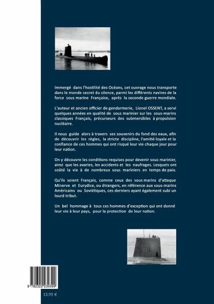 Immergé dans l'hostilité des Océans, cet ouvrage nous transporte dans le monde secret du silence,parmi les différents navires de la force sous marine Française, après la seconde guerre mondiale.L'auteur et ancien officier de gendarmerie, Lionel OSSENT,a servi quelques années en qualité de sous marinier sur lessous-marins classiques Français, précurseurs des submersiblesà propulsion nucléaire.Il nous guide alors à travers ses souvenirs du fond des eaux,afin de découvrir les règles, la stricte discipline, l'amitié loyaleet la confiance de ces hommes qui ont risqué leur vie chaquejour pour leur nation.On y découvre les conditions requises pour devenir sous marinier, ainsi que les avaries, les accidents et les naufrages. Lesquels ont coûté la vie à de nombreux sous mariniers en temps de paix.Qu'ils soient Français, comme ceux des sous marins d'attaque Minerve et Eurydice, ou étrangers, en référence aux sous-marins Américains ou Soviétiques, ces derniers ayant également subi un lourd tribut.Un bel hommage à tous ces hommes d'exception qui ont donné leur vie à leur pays, pour la protection de leur nation