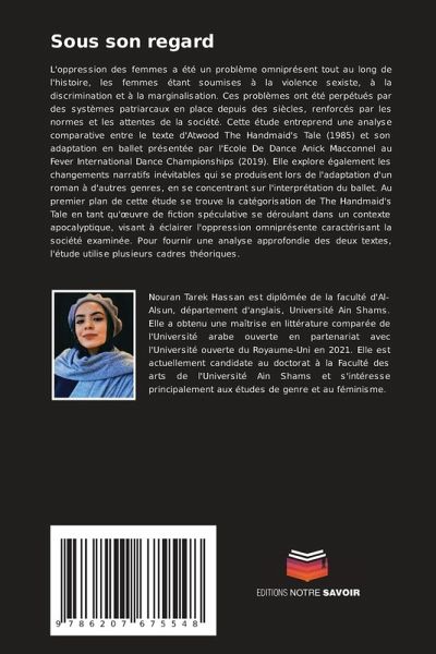 L'oppression des femmes a été un problème omniprésent tout au long de l'histoire, les femmes étant soumises à la violence sexiste, à la discrimination et à la marginalisation. Ces problèmes ont été perpétués par des systèmes patriarcaux en place depuis des siècles, renforcés par les normes et les attentes de la société. Cette étude entreprend une analyse comparative entre le texte d'Atwood The Handmaid's Tale (1985) et son adaptation en ballet présentée par l'Ecole De Dance Anick Macconnel au Fever International Dance Championships (2019). Elle explore également les changements narratifs inévitables qui se produisent lors de l'adaptation d'un roman à d'autres genres, en se concentrant sur l'interprétation du ballet. Au premier plan de cette étude se trouve la catégorisation de The Handmaid's Tale en tant qu'oeuvre de fiction spéculative se déroulant dans un contexte apocalyptique, visant à éclairer l'oppression omniprésente caractérisant la société examinée. Pour fournir une analyse approfondie des deux textes, l'étude utilise plusieurs cadres théoriques.