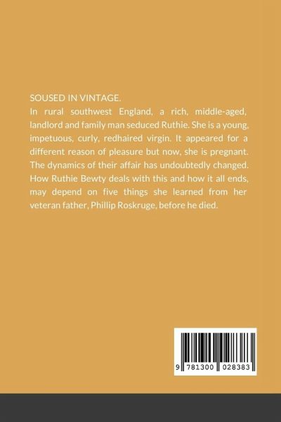 SOUSED IN VINTAGE. In rural southwest England, a rich, middle-aged, landlord and family man seduced Ruthie. She is a young, impetuous, curly, redhaired virgin. It appeared for a different reason of pleasure but now, she is pregnant. The dynamics of their affair has undoubtedly changed. How Ruthie Bewty deals with this and how it all ends, may depend on five things she learned from her veteran father, Phillip Roskruge, before he died.