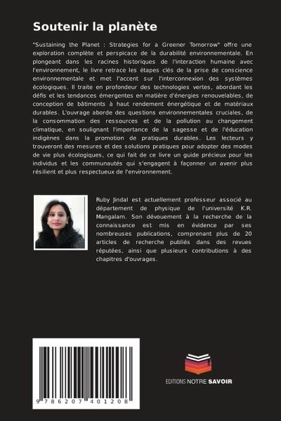 "Sustaining the Planet : Strategies for a Greener Tomorrow" offre une exploration complète et perspicace de la durabilité environnementale. En plongeant dans les racines historiques de l'interaction humaine avec l'environnement, le livre retrace les étapes clés de la prise de conscience environnementale et met l'accent sur l'interconnexion des systèmes écologiques. Il traite en profondeur des technologies vertes, abordant les défis et les tendances émergentes en matière d'énergies renouvelables, de conception de bâtiments à haut rendement énergétique et de matériaux durables. L'ouvrage aborde des questions environnementales cruciales, de la consommation des ressources et de la pollution au changement climatique, en soulignant l'importance de la sagesse et de l'éducation indigènes dans la promotion de pratiques durables. Les lecteurs y trouveront des mesures et des solutions pratiques pour adopter des modes de vie plus écologiques, ce qui fait de ce livre un guide précieux pour les individus et les communautés qui s'engagent à façonner un avenir plus résilient et plus respectueux de l'environnement.