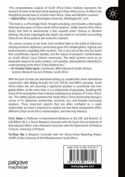 Chapter 1. Introduction.- Chapter 2. Explaining South Africa's China Choice.- Chapter 3. Leadership, global agendas and domestic determinants of South Africa's foreign policy towards China: the Zuma and Ramaphosa years.- Chapter 4. South Africa-China Relations of Seven Decades (1949-2019): Review and Reflection.- Chapter 5. The Political Economy of South Africa-China Trade and Economic Relations.- Chapter 6. Manufacturing for intra-Africa trade: a focused response to China's dominant position in Africa for South Africa.- Chapter 7. Behind the Headlines: Chinese Media Engagement in South Africa.- Chapter 8. South Africa's Special Economic Zones as destinations for Chinese investment: Problems and possibilities.- Chapter 9. The Drive For Investment in South Africa: Does Chinese Agro-investment Differ In The Country Compared To Elsewhere On The Continent? .- Chapter 10. Chinese and South African Labour Relations: An Analysis.- Chapter 11. The Role of Culture and Education in South Africa-China relations.- Chapter 12. South Africa's Chinese Communities: An Update.- Chapter 13. The Chinese community and the search for security.- Chapter 14. Melting Point - A personal essay by Ufrieda Ho.