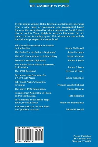 Following the format of the first volume South Africa: In Transition to What? (1988), each of the chapters in this new volume focuses on a segment of the jigsaw puzzle from which South Africa's future will be assembled and is datelined to emphasize how the situation, event, or issue being addressed appeared through a particular set of lenses at a particular time. This collection seeks to impress upon readers (especially Americans) that the shape of the post-apartheid South Africa now emerging is being determined primarily by internal factors. Eminent Persons interlocutors, distinguished advisory committees, economic and diplomatic sanctions, and other externally devised initiatives affected, but could not mandate how South Africa's long-fractured society would find its way. The contributors to this volume come from a range of geographical and professional bases, but share one important qualification: residence or repeated physical presence in South Africa.