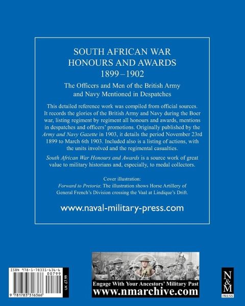 This detailed reference work was compiled from official sources. It records the glories of the British Army and Navy during the Boer war, listing regiment by regiment all honours and awards, mentions in despatches and officers' promotions. Originally published by the Army and Navy Gazette in 1903, it details the period November 23rd 1899 to March 6th 1903. Included also is a listing of actions, with the units involved and the regimental casualties. South African War Honours and Awards is a source work of great value to military historians and, especially, to medal collectors.