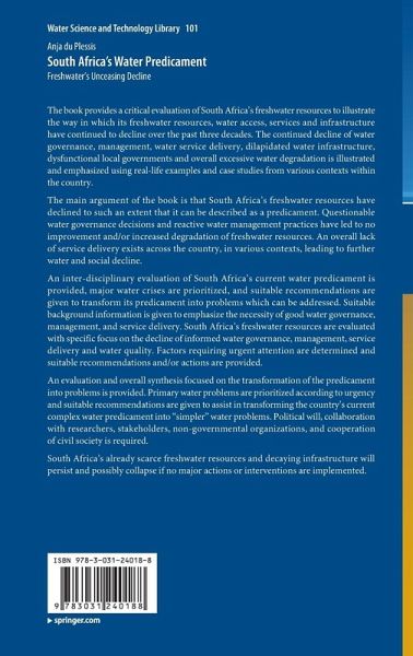 The book provides a critical evaluation of South Africa's freshwater resources to illustrate the way in which its freshwater resources, water access, services and infrastructure have continued to decline over the past three decades. The continued decline of water governance, management, water service delivery, dilapidated water infrastructure, dysfunctional local governments and overall excessive water degradation is illustrated and emphasized using real-life examples and case studies from various contexts within the country.