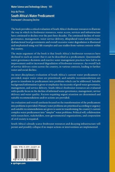 The book provides a critical evaluation of South Africa's freshwater resources to illustrate the way in which its freshwater resources, water access, services and infrastructure have continued to decline over the past three decades. The continued decline of water governance, management, water service delivery, dilapidated water infrastructure, dysfunctional local governments and overall excessive water degradation is illustrated and emphasized using real-life examples and case studies from various contexts within the country.