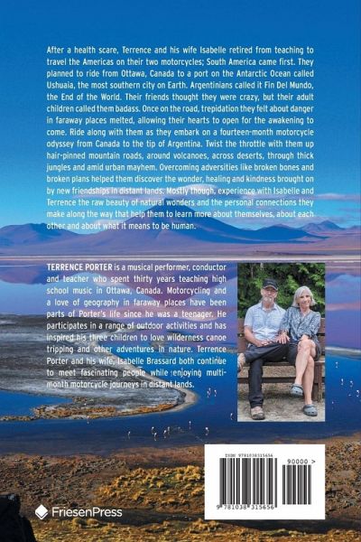 After a health scare, Terrence and his wife Isabelle retired from teaching to travel the Americas on their two motorcycles; South America came first. They planned to ride from Ottawa, Canada to a port on the Antarctic Ocean called Ushuaia, the most southern city on Earth. Argentinians called it Fin Del Mundo, the End of the World. Their friends thought they were crazy, but their adult children called them badass. Once on the road, trepidation they felt about danger in faraway places melted, allowing their hearts to open for the awakening to come. Ride along with them as they embark on a fourteen-month motorcycle odyssey from Canada to the tip of Argentina. Twist the throttle with them up hair-pinned mountain roads, around volcanoes, across deserts, through thick jungles and amid urban mayhem. Overcoming adversities like broken bones and broken plans helped them discover the wonder, healing and kindness brought on by new friendships in distant lands. Mostly though, experience with Isabelle and Terrence the raw beauty of natural wonders and the personal connections they make along the way that help them to learn more about themselves, about each other and about what it means to be human.
