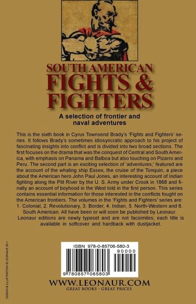 A selection of frontier and naval adventures This is the sixth book in Cyrus Townsend Brady's 'Fights and Fighters' series. It follows Brady's sometimes idiosyncratic approach to his project of fascinating insights into conflict and is divided into two broad sections. The first focuses on the drama that was the conquest of Central and South America, with emphasis on Panama and Balboa but also touching on Pizarro and Peru. The second part is an exciting selection of 'adventures;' featured are the account of the whaling ship Essex, the cruise of the Tonquin, a piece about the American hero John Paul Jones, an interesting account of Indian fighting along the Pitt River by the U. S. Army under Crook in 1868 and finally an account of boyhood in the West told in the first person. This series contains essential information for those interested in the conflicts fought on the American frontiers. The volumes in the 'Fights and Fighters' series are: 1. Colonial, 2. Revolutionary, 3. Border, 4. Indian, 5. North-Western and 6. South American. All have been or will soon be published by Leonaur. Leonaur editions are newly typeset and are not facsimiles; each title is available in softcover and hardback with dustjacket.