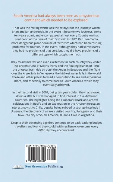 South America had always been seen as a mysterious continent which needed to be explored. That was the feeling which was the catalyst for the journeys which Brian and Jan undertook. In the event it became two journeys, some ten years apart, and encompassed almost every Country on that continent. At the time of their first visit, in 1997, Peru seemed a more dangerous place because of terrorism which had been causing problems for tourists. In the event, although they had some scares, they had no problems of that sort, but they did have problems of a different type which caught them out. They found interest and even excitement in each country they visited. The ancient ruins of Machu Pichu and the floating islands of Peru; the unusual train ride through the Andes in Ecuador; and the flight over the Angel falls in Venezuela, the highest water falls in the world. These and other places formed a compulsion to see and experience more, and especially to come back to South America, which they eventually achieved. In their second visit in 2007, being ten years older. they had slowed down a little but still managed to find interest in five different countries. The highlights being the exuberant Brazilian Carnival celebrations in Recife and an exploration in the Amazon forest; an interesting visit to Chile, despite being robbed; a strange interlude in Uruguay; the discovery of a rarely visited country, Paraguay; and their favourite city of South America, Buenos Aires in Argentina. Despite their advancing age they continue to be back-packing budget travellers and found they could, with resilience, overcome every difficulty they encountered.