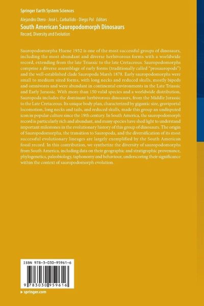 Sauropodomorpha Huene 1932 is one of the most successful groups of dinosaurs, including the most abundant and diverse herbivorous forms with a worldwide record, extending from the late Triassic to the late Cretaceous. Sauropodomorphs comprise a diverse assemblage of early forms (traditionally called "prosauropods") and the well-established clade Sauropoda Marsh 1878. Early sauropodomorphs were small to medium sized forms, with long necks and reduced skulls, mostly bipeds and omnivores and were abundant in continental environments in the Late Triassic and Early Jurassic. With more than 150…mehr