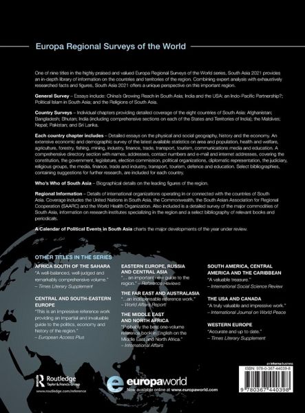 Exhaustively researched and updated, South Asia 2021 is an in-depth library of information on the countries and territories of this vast world region. General Survey Essays by specialists examine issues of regional importance. Country Surveys Individual chapters on each country, containing: - essays on the geography, recent history and economy of each nation - up-to-date statistical surveys of economic and social indicators - a comprehensive directory providing contact details and other useful information for the most significant political and commercial institutions. In addition, there are separate sections covering each of the states and territories of India. Regional Information - detailed coverage of international organizations and their recent activities in South Asia - information on research institutes engaged in the study of the region - a survey of the major commodities of South Asia - bibliographies of relevant books and periodicals. Additional features - biographical profiles of almost 300 prominent individuals in the region.