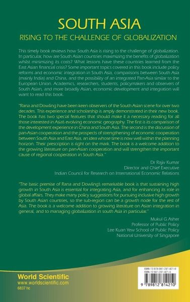 This timely book reviews how South Asia is rising to the challenge of globalization. In particular, how are South Asian countries maximizing the benefits of globalization whilst minimizing its costs? What lessons have these countries learned from the East Asian financial crisis? What actions have they taken at the national, regional, and global level? Some important topics covered in this book include policy reforms and economic integration in South Asia, comparisons between South Asia (mainly India) and China, and economic linkages between South Asia and East Asia including the possibility of an integrated Pan-Asia similar to the European Union. Academics, researchers, students, policymakers and observers of South Asian, and more broadly Asian, economic development and integration will want to read this book.