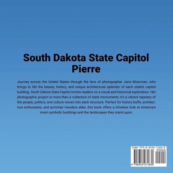 Immerse yourself in the architectural splendor and rich cultural heritage of South Dakota State Capitol: PIERRE. In this striking visual journey, photographer and journalist Jane Moorman captures the essence of South Dakota's history, artistry, and identity through the lens of its grand capitol building. With its copper dome, neo-classical design, and opulent details like Italian terrazzo floors and Victorian stained glass, the Capitol is a tribute to the people and values of the state. The book highlights notable features such as the Trail of Governors-life-sized bronze statues honoring past leaders-the rotunda's elegant murals and sculptures, and the symbolic tribal flag display celebrating the unity between Native American nations and the state government. From its origins in the Dakota Territory to its present-day legacy, this book showcases a building that is both a functional seat of power and a masterpiece of public art and architecture. Whether you're passionate about American history, civic design, or regional culture, this book offers an intimate look at one of the Midwest's most majestic landmarks.
