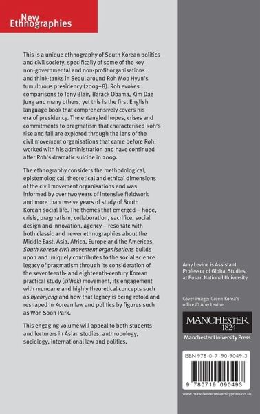 This is a unique ethnographic study of the practical, theoretical, methodological, ethical and social dimensions of some key non-governmental organisations (NGOs), non-profit organisations (NPOs), and think tanks in Seoul during Roh Moo Hyun's tumultuous presidency (2003-8).
