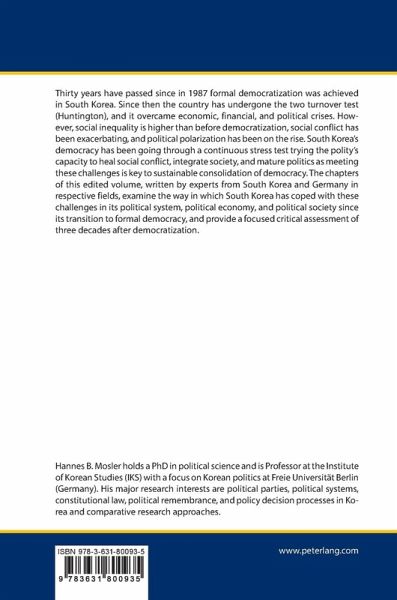 Thirty years have passed since in 1987 formal democratization was achieved in South Korea. Since then the country has undergone the two turnover test (Huntington), and it overcame economic, financial, and political crises. However, social inequality is higher than before democratization, social conflict has been exacerbating, and political polarization has been on the rise. South Korea's democracy has been going through a continuous stress test trying the polity's capacity to heal social conflict, integrate society, and mature politics as meeting these challenges is key to sustainable consolidation of democracy. The chapters of this edited volume, written by experts from South Korea and Germany in respective fields, examine the way in which South Korea has coped with these challenges in its political system, political economy, and political society since its transition to formal democracy, and provide a focused critical assessment of three decades after democratization.