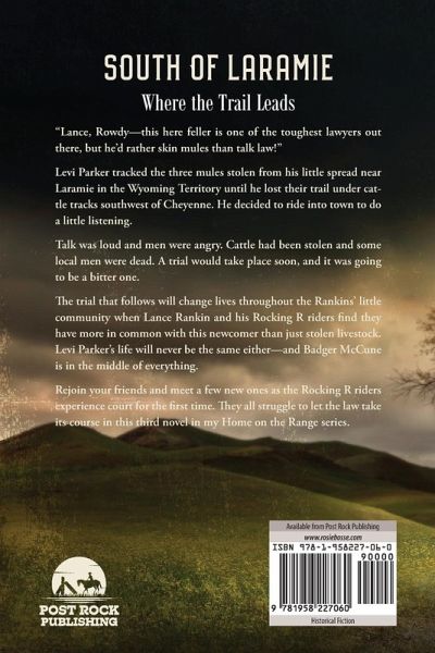 "Lance, Rowdy-this here feller is one of the toughest lawyers out there, but he'd rather skin mules than talk law!" Levi Parker tracked the three mules stolen from his little spread near Laramie in the Wyoming Territory until he lost their trail under cattle tracks southwest of Cheyenne. He decided to ride into town to do a little listening. Talk was loud and men were angry. Cattle had been stolen, and some local men were dead. A trial would take place soon, and it was going to be a bitter one. The trial that follows will change lives throughout the Rankins' little community when Lance Rankin and his Rocking R riders find they have more in common with this newcomer than just stolen livestock. Levi Parker's life will never be the same either-and Badger McCune is in the middle of everything. Rejoin your friends and meet a few new ones as the Rocking R riders experience court for the first time. They all struggle to let the law take its course in this third novel in my Home on the Range series.