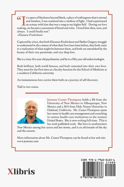 "In a space of blackness beyond black, a place of nothingness that was eternal and timeless, I was scattered into a rainbow of light. I had experienced an ecstasy with him that was a song to my higher Self. During our love making, we became a sacrament of bread and wine. I loved him then, now, and always. I could finally rest." ~Eleanora Fredrickson~ Captured by a love, that both Eleanora Fredrickson and Stefan Gregory struggle to understand in the context of what their lives have been before, they both come to a realization of what might be between them, and both are astonished by the beauty of their very passionate, and very deep love. She is a sixty-five year old psychiatrist, and he is a fifty year old endocrinologist. Both brilliant, both world famous, and both cemented into their own lives. They meet for the first time at a faculty function for the School of Medicine at a southern California university. An instantaneous love carries them both on a journey of self discovery. Told in two voices.