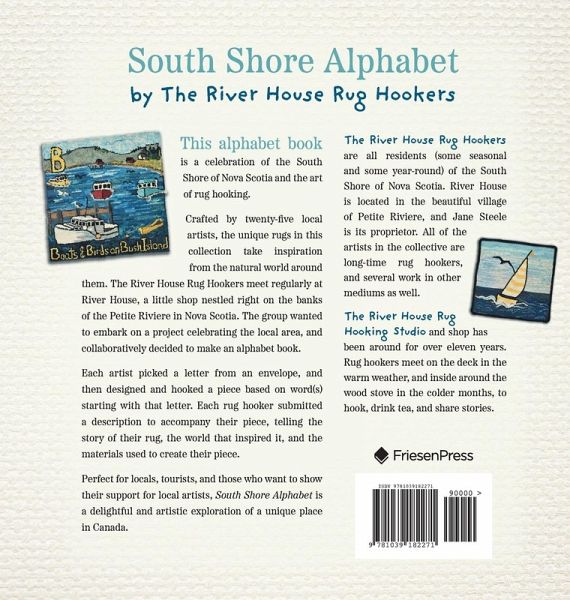 This alphabet book is a celebration of the South Shore of Nova Scotia and the art of rug hooking. Crafted by twenty-five local artists, the unique rugs in this collection take inspiration from the natural world around them. The River House Rug Hookers meet regularly at River House, a little shop nestled right on the banks of the Petite Riviere in Nova Scotia. The group wanted to embark on a project celebrating the local area, and collaboratively decided to make an alphabet book. Each artist picked a letter from an envelope, and then designed and hooked a piece based on word(s) starting with that letter. Each rug hooker submitted a description to accompany their piece, telling the story of their rug, the world that inspired it, and the materials used to create their piece. Perfect for locals, tourists, and those who want to show their support for local artists, South Shore Alphabet is a delightful and artistic exploration of a unique place in Canada.