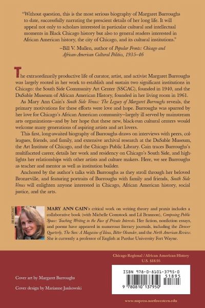 The extraordinarily productive life of curator, artist, and activist Margaret Burroughs was largely rooted in her work to establish and sustain two significant institutions in Chicago: the South Side Community Art Center (SSCAC), founded in 1940, and the DuSable Museum of African American History, founded in her living room in 1961. As Mary Ann Cain's South Side Venus: The Legacy of Margaret Burroughs reveals, the primary motivations for these efforts were love and hope. Burroughs was spurred by her love for Chicago's African American community—largely ill served by mainstream arts organizations—and by her hope that these new, black-run cultural centers would welcome many generations of aspiring artists and art lovers. This first, long–awaited biography of Burroughs draws on interviews with peers, colleagues, friends, and family, and extensive archival research at the DuSable Museum, the Art Institute of Chicago, and the Chicago Public Library. Cain traces Burroughs's multifaceted career, details her work and residency on Chicago's South Side, and highlights her relationships with other artists and culture makers. Here, we see Burroughs as teacher and mentor as well as institution builder. Anchored by the author's talks with Burroughs as they stroll through her beloved Bronzeville, and featuring portraits of Burroughs with family and friends, South Side Venus will enlighten anyone interested in Chicago, African American history, social justice, and the arts.
