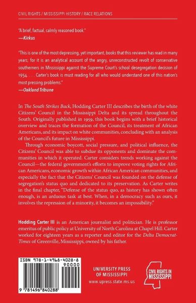 In The South Strikes Back, Hodding Carter III describes the birth of the white Citizens' Council in the Mississippi Delta and its spread throughout the South. Carter begins with a brief historical overview and traces the formation of the Council, its treatment of African Americans, and its impact on white communities, concluding with an analysis of the Council's future in Mississippi. Through economic boycott, social pressure, and political influence, the Citizens' Council was able to subdue its opponents and dominate the communities in which it operated. Carter considers trends working against the Council--the federal government's efforts to improve voting rights for African Americans, economic growth within African American communities, and especially the fact that the Citizens' Council was founded on the defense of segregation's status quo and dedicated to its preservation. As Carter writes in the final chapter, "Defense of the status quo, as history has shown often enough, is an arduous task at best. When, in a democracy such as ours, it involves the repression of a minority, it becomes an impossibility."