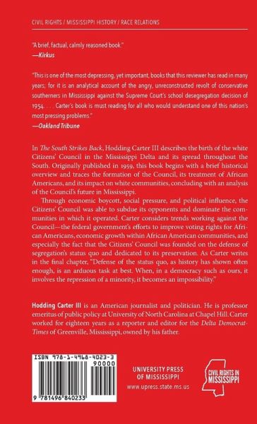 In The South Strikes Back, Hodding Carter III describes the birth of the white Citizens' Council in the Mississippi Delta and its spread throughout the South. Carter begins with a brief historical overview and traces the formation of the Council, its treatment of African Americans, and its impact on white communities, concluding with an analysis of the Council's future in Mississippi. Through economic boycott, social pressure, and political influence, the Citizens' Council was able to subdue its opponents and dominate the communities in which it operated. Carter considers trends working against the Council--the federal government's efforts to improve voting rights for African Americans, economic growth within African American communities, and especially the fact that the Citizens' Council was founded on the defense of segregation's status quo and dedicated to its preservation. As Carter writes in the final chapter, "Defense of the status quo, as history has shown often enough, is an arduous task at best. When, in a democracy such as ours, it involves the repression of a minority, it becomes an impossibility."