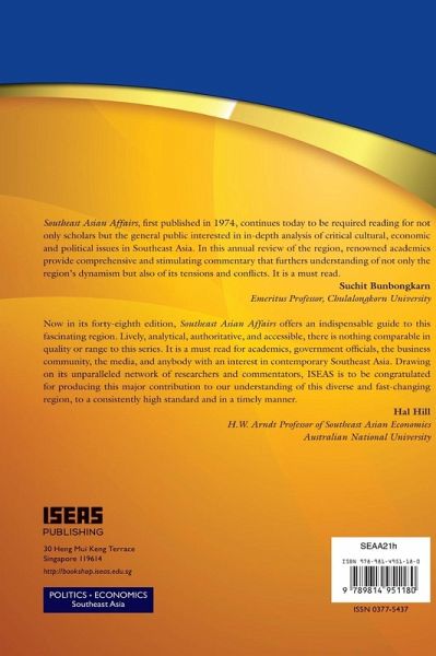 "Southeast Asian Affairs, first published in 1974, continues today to be required reading for not only scholars but the general public interested in in-depth analysis of critical cultural, economic and political issues in Southeast Asia. In this annual review of the region, renowned academics provide comprehensive and stimulating commentary that furthers understanding of not only the region's dynamism but also of its tensions and conflicts. It is a must read." - Suchit Bunbongkarn, Emeritus Professor, Chulalongkorn University "Now in its forty-eighth edition, Southeast Asian Affairs offers an indispensable guide to this fascinating region. Lively, analytical, authoritative, and accessible, there is nothing comparable in quality or range to this series. It is a must read for academics, government officials, the business community, the media, and anybody with an interest in contemporary Southeast Asia. Drawing on its unparalleled network of researchers and commentators, ISEAS is to be congratulated for producing this major contribution to our understanding of this diverse and fast-changing region, to a consistently high standard and in a timely manner." - Hal Hill, H.W. Arndt Professor of Southeast Asian Economies, Australian National University