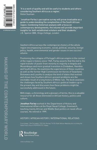 Southern Africa surveys the contemporary history of the whole region encompassing economic, social, political, security, foreign policy, health, environmental and gender issues in one short succinct volume. Positioning the collapse of Portugal's African Empire in the context of the region's history since 1945, Farley asserts that this collapse set in motion a train of events that eventually led to the transition of power from minority to majority rule in Angola, Mozambique, Zimbabwe, Namibia and South Africa. He examines the experiences of these countries as well as the former High Commission territories of Swaziland, Botswana and Lesotho to analyse the kind of states that evolved and shows how Southern Africa's present problems are the inevitable result of a long history of white rule. The book assesses the challenges faced by Southern Africa's political leaders up to the present day and discusses how these problems might be successfully addressed in the future. With maps, a chronology and glossary, this is a valuable resource for all those interested in African history, politics and culture.