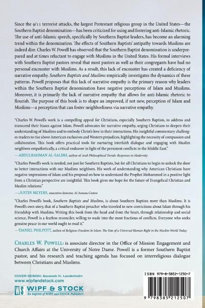 Since the 9/11 terrorist attacks, the largest Protestant religious group in the United States--the Southern Baptist denomination--has been criticized for using and fostering anti-Islamic rhetoric. The use of anti-Islamic speech, specifically by Southern Baptist leaders, has become an alarming trend within the denomination. The effects of Southern Baptists' antipathy towards Muslims are indeed dire. Charles W. Powell has observed that the Southern Baptist denomination is underprepared and at times reluctant to engage with Muslims in the United States. His formal interviews with Southern Baptist pastors reveal that most pastors as well as their congregants have had no personal encounter with Muslims. As a result, this lack of encounter has created a deficiency of narrative empathy. Southern Baptists and Muslims empirically investigates the dynamics of these patterns. Powell proposes that this lack of narrative empathy is the primary reason why leaders within the Southern Baptist denomination have negative perceptions of Islam and Muslims. Moreover, it is primarily the lack of narrative empathy that allows for anti-Islamic rhetoric to flourish. The purpose of this book is to shape an improved, if not new, perception of Islam and Muslims--a perception that can foster neighborliness via narrative empathy.