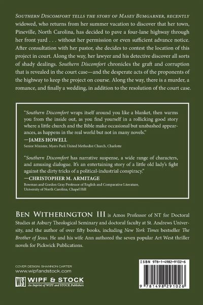Southern Discomfort tells the story of Masey Bumgarner, recently widowed, who returns from her summer vacation to discover that her town, Pineville, North Carolina, has decided to pave a four-lane highway through her front yard . . . without her permission or even sufficient advance notice. After consultation with her pastor, she decides to contest the location of this project in court. Along the way, her lawyer and his detective discover all sorts of shady dealings. Southern Discomfort chronicles the graft and corruption that is revealed in the court case--and the desperate acts of the proponents of the highway to keep the project on course. Along the way, there is a murder, a romance, and finally a wedding, in addition to the resolution of the court case.