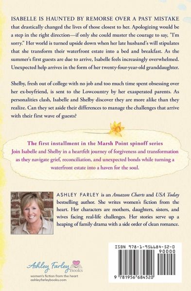 Isabelle is haunted by remorse over a past mistake that drastically changed the lives of those closest to her. Apologizing would be a step in the right direction-if only she could muster the courage to say, "I'm sorry." Her world is turned upside down when her late husband's will stipulates that she transform their waterfront estate into a bed and breakfast. As the summer's first guests are due to arrive, Isabelle feels increasingly overwhelmed. Unexpected help arrives in the form of her twenty-four-year-old granddaughter. Shelby, fresh out of college with no job and too much time spent obsessing over her ex-boyfriend, is sent to the Lowcountry by her exasperated parents. As personalities clash, Isabelle and Shelby discover they are more alike than they realize. Can they set aside their differences to manage the challenges that arrive with their first wave of guests? Top of Form