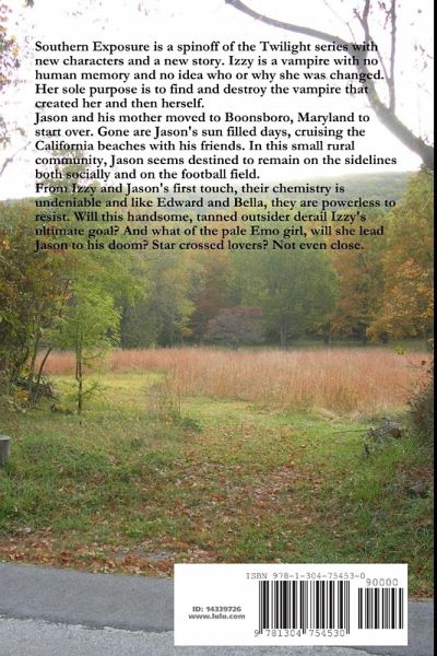 Southern Exposure is a spinoff of the Twilight series with new characters and a new story. Izzy is a vampire, but she has no human memory and no idea who or why she was changed. Her sole purpose is to find and destroy the vampire that created her and then destroy herself. Jason and his mother moved to Boonsboro, Maryland to start over. Gone are Jason's sun filled days, cruising the California beaches with his friends. In this small rural community, Jason seems destined to remain on the sidelines both socially and on the football field. From Izzy and Jason's first touch, their chemistry is undeniable and like Edward and Bella, they are powerless to resist. Will this handsome, tanned outsider derail Izzy's ultimate goal? And what of the pale Emo girl, will she lead Jason to his doom? Star crossed lovers? Not even close. This is Book I in the Southern Exposure Saga.