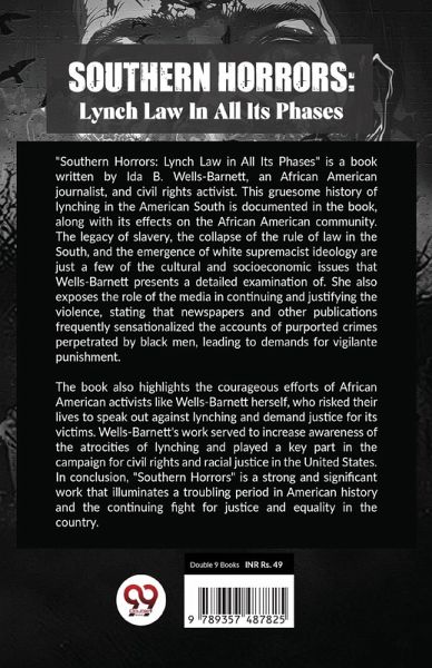 "Southern Horrors: Lynch Law in All Its Phases" is a book written by Ida B. Wells-Barnett, an African American journalist, and civil rights activist. This gruesome history of lynching in the American South is documented in the book, along with its effects on the African American community. The legacy of slavery, the collapse of the rule of law in the South, and the emergence of white supremacist ideology are just a few of the cultural and socioeconomic issues that Wells-Barnett presents a detailed examination of. She also exposes the role of the media in continuing and justifying the violence, stating that newspapers and other publications frequently sensationalized the accounts of purported crimes perpetrated by black men, leading to demands for vigilante punishment. The book also highlights the courageous efforts of African American activists like Wells-Barnett herself, who risked their lives to speak out against lynching and demand justice for its victims. Wells-Barnett's work served to increase awareness of the atrocities of lynching and played a key part in the campaign for civil rights and racial justice in the United States. In conclusion, "Southern Horrors" is a strong and significant work that illuminates a troubling period in American history and the continuing fight for justice and equality in the country.